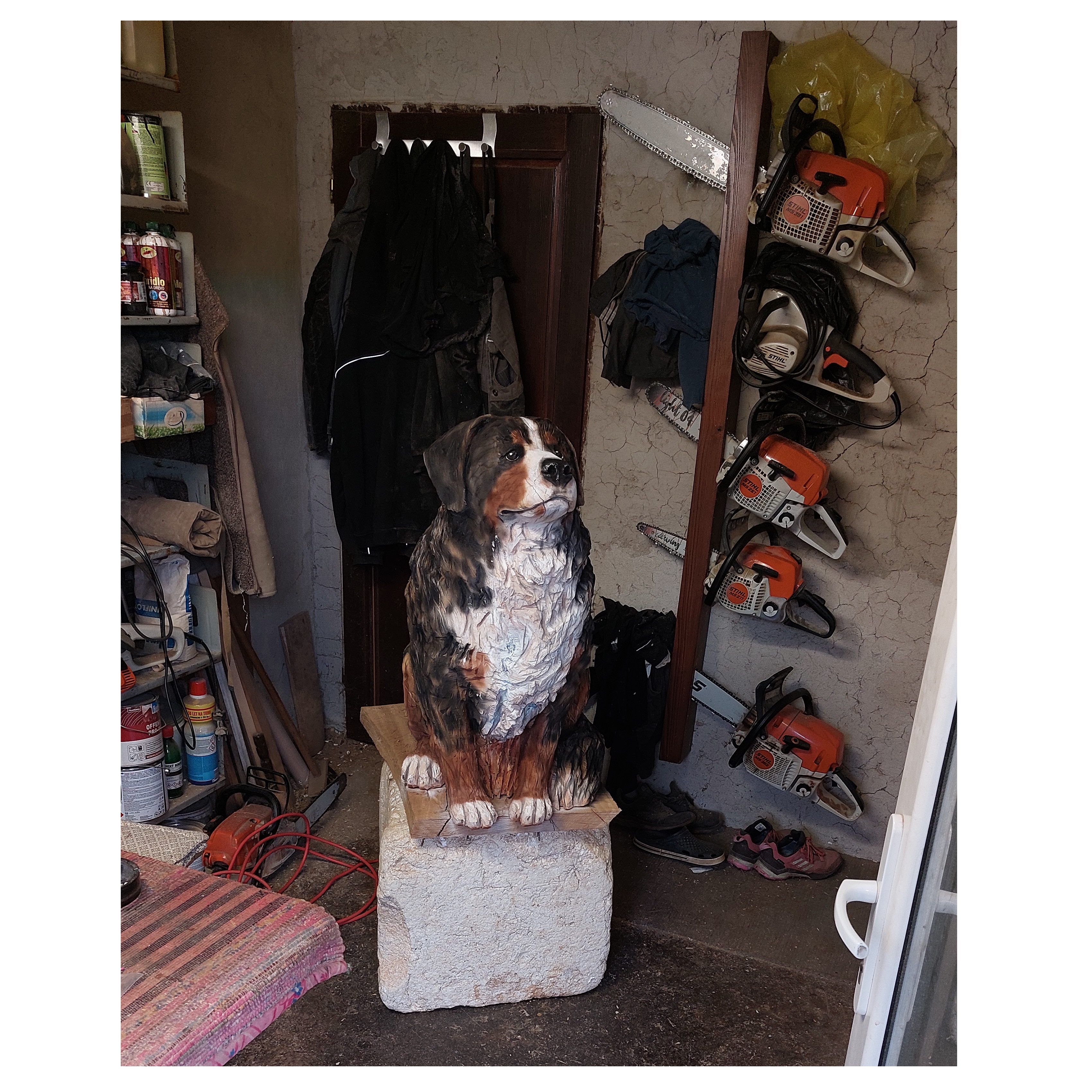 Socha stojí pevně na širokých tlapách a její postoj je přirozený, jistý a harmonický. Každý detail je pečlivě propracován: jemné modelování svalů, charakteristická mohutnost hrudníku i elegantní linie hřbetu. Pro toto plemeno typické tříbarevné zbarvení je naznačeno reliéfní strukturou dřeva, drobnými řezy a jemným texturováním, které vytváří dojem měkké, husté srsti.