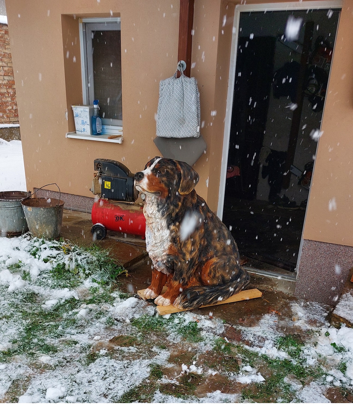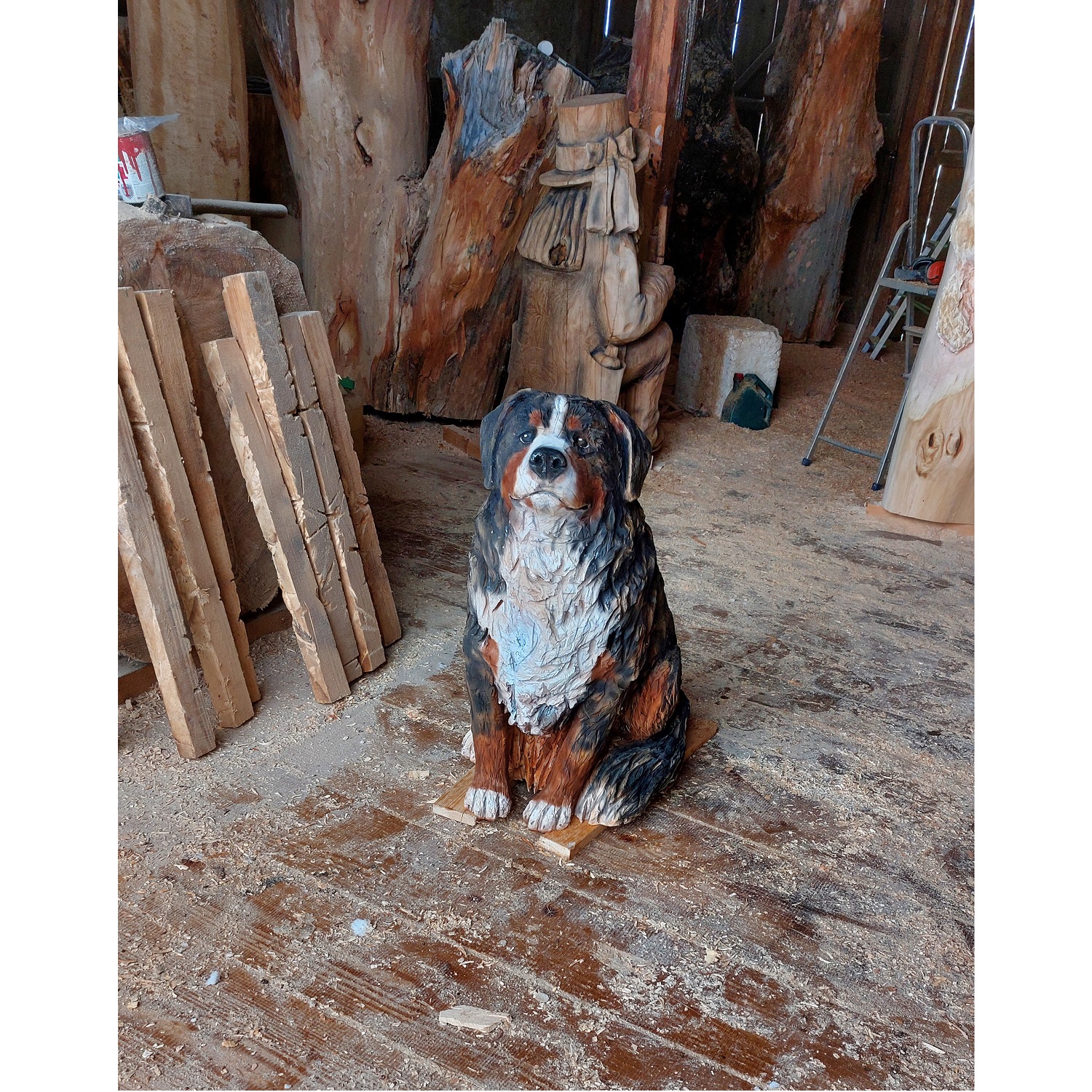 Ručně vyřezávaná dřevěná socha bernského salašnického psa působí mimořádně živým a ušlechtilým dojmem, jako by v sobě nesla klidnou sílu a přátelskou povahu tohoto oblíbeného plemene. Řezbář dokázal zachytit typické rysy bernského salašníka – moudrý, dobrosrdečný výraz, mohutnou stavbu těla i jeho vyrovnaný temperament.