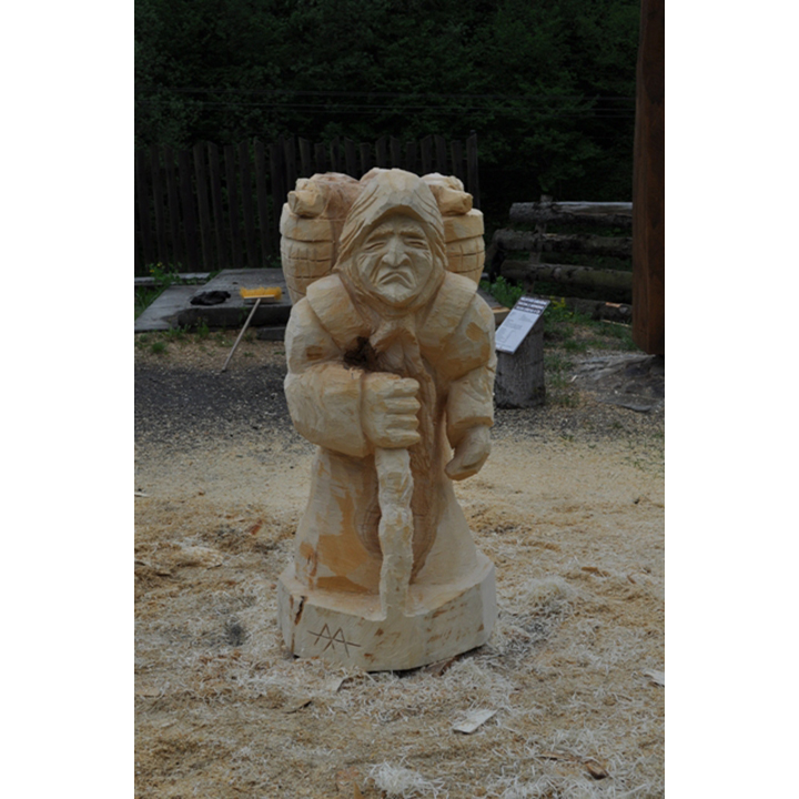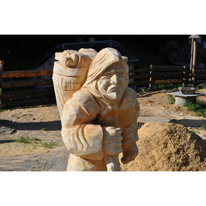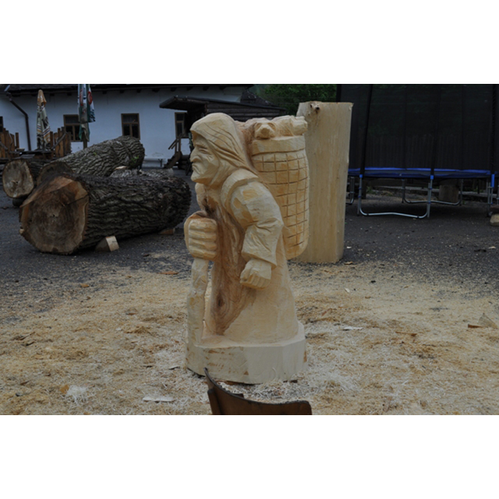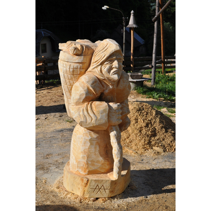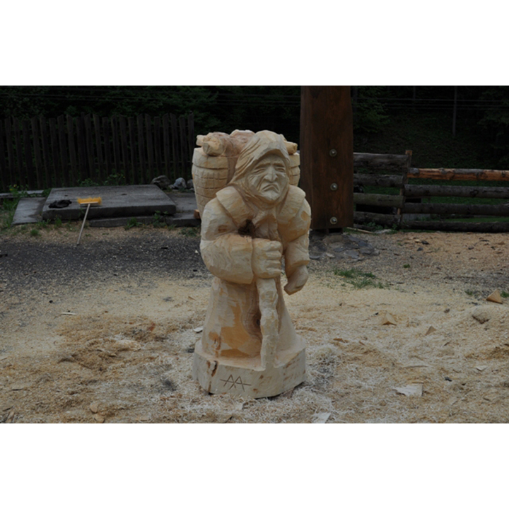 Zahradní dřevěná socha – dřevěná čarodějnice s košíkem štěňátek