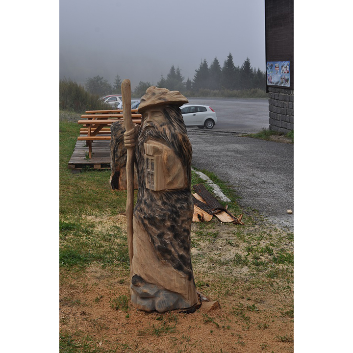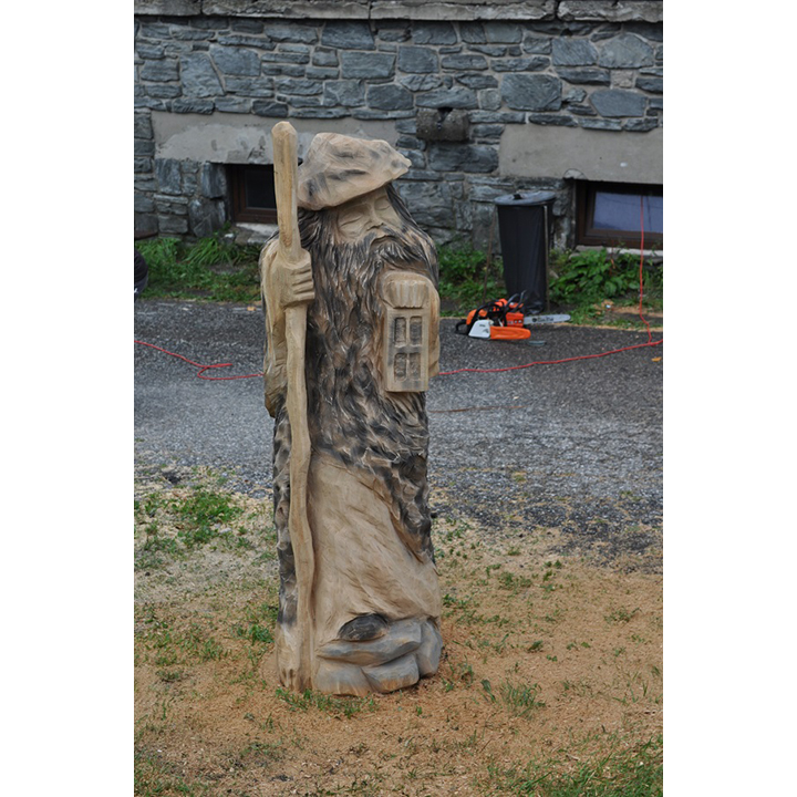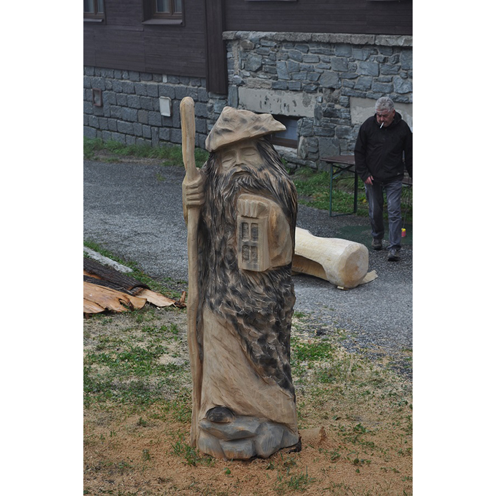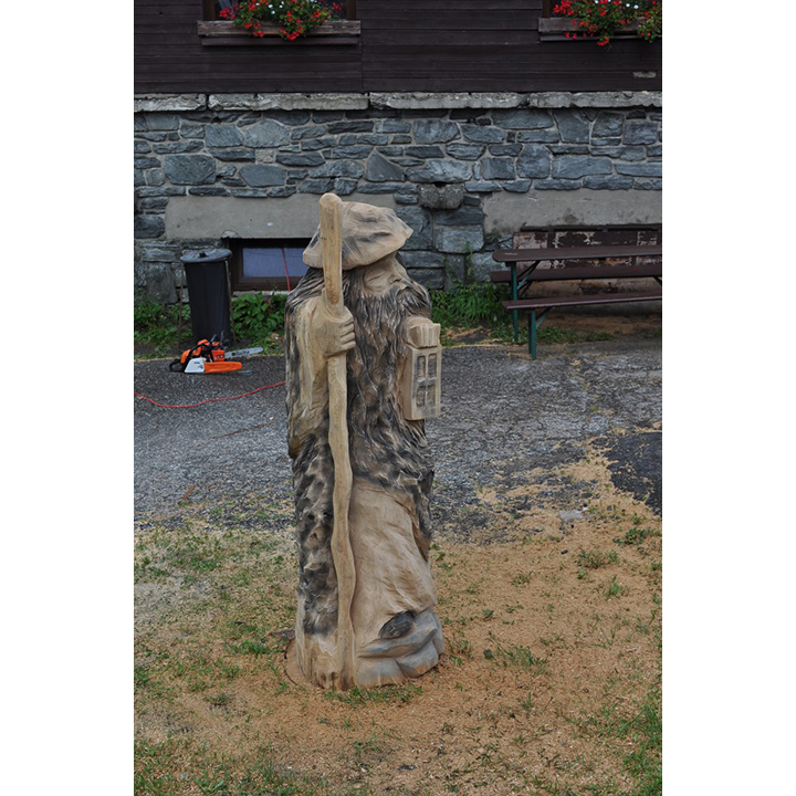 “Půjdem, jak tenkrát, tou nocí vláhou ….. v ruce lampion, k tomu lampion” zpívá známá česká zpěvačka Lucie Bílá ve své skladbě lampion. Kam asi půjde tento dědeček, když má v ruce lampion? Díky světlu svíček se lampion stal jakýmsi symbolem naděje. Představte si, že jste v noci uprostřed lesa a odrazu spatříte světlo z lampiónu. Možná i to jsou pocity, které ve vás může vzbudit dřevěná socha znázorňující dědečka s lampionům v ruce. Dědeček má v rukou i hůl, takže se určitě neztratí. Tuto dřevěnou sochu je vhodné umístit před vchodové dveře. Může tak symbolizovat: “hlídám to tu ve dne v noci, jste v bezpečí, ať se líbí, vstupte!”. Výška této sochy dosahuje 200 cm a je vyřezaná z dubového dřeva.