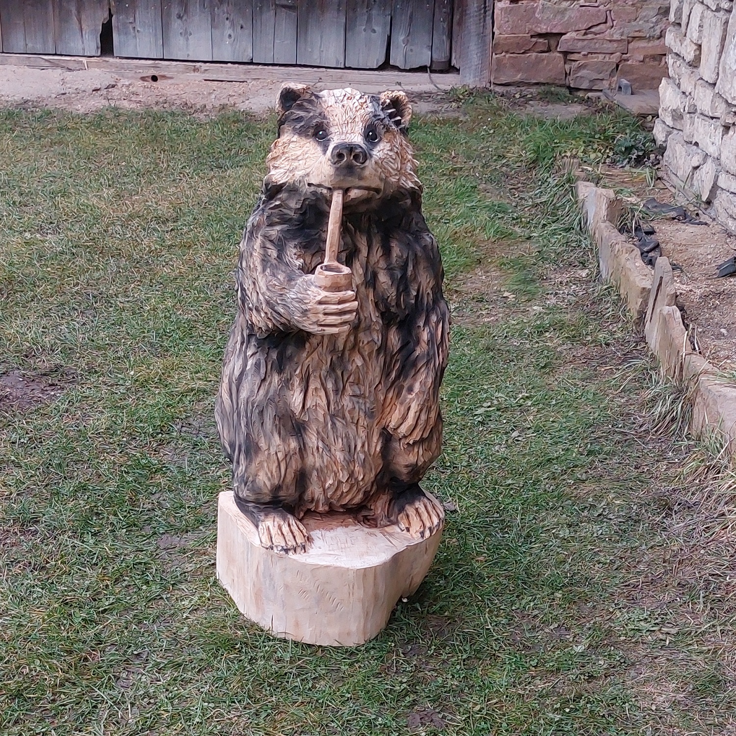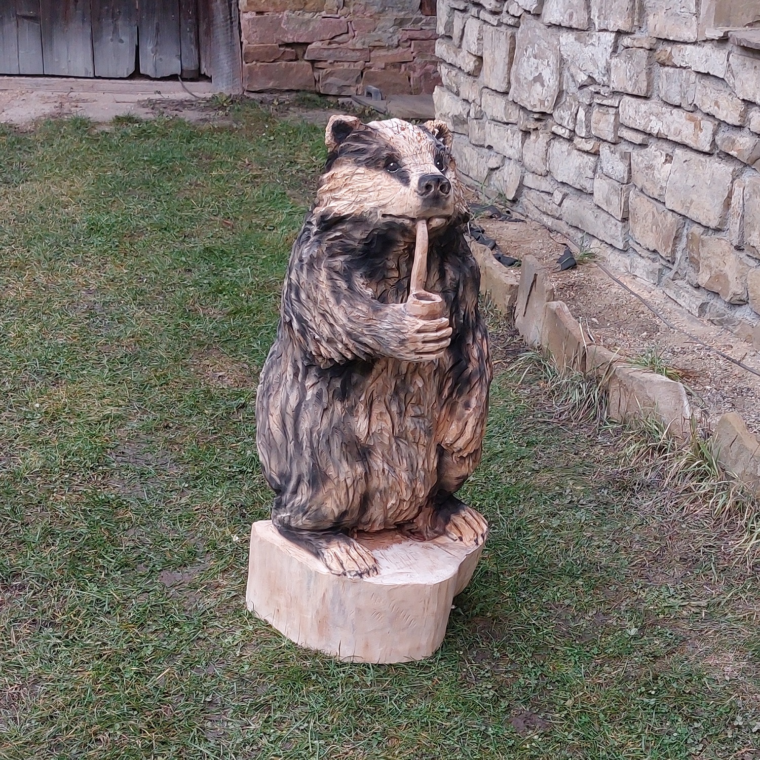 Ručně vyřezávaná socha – Dřevěný jezevec s dýmkou