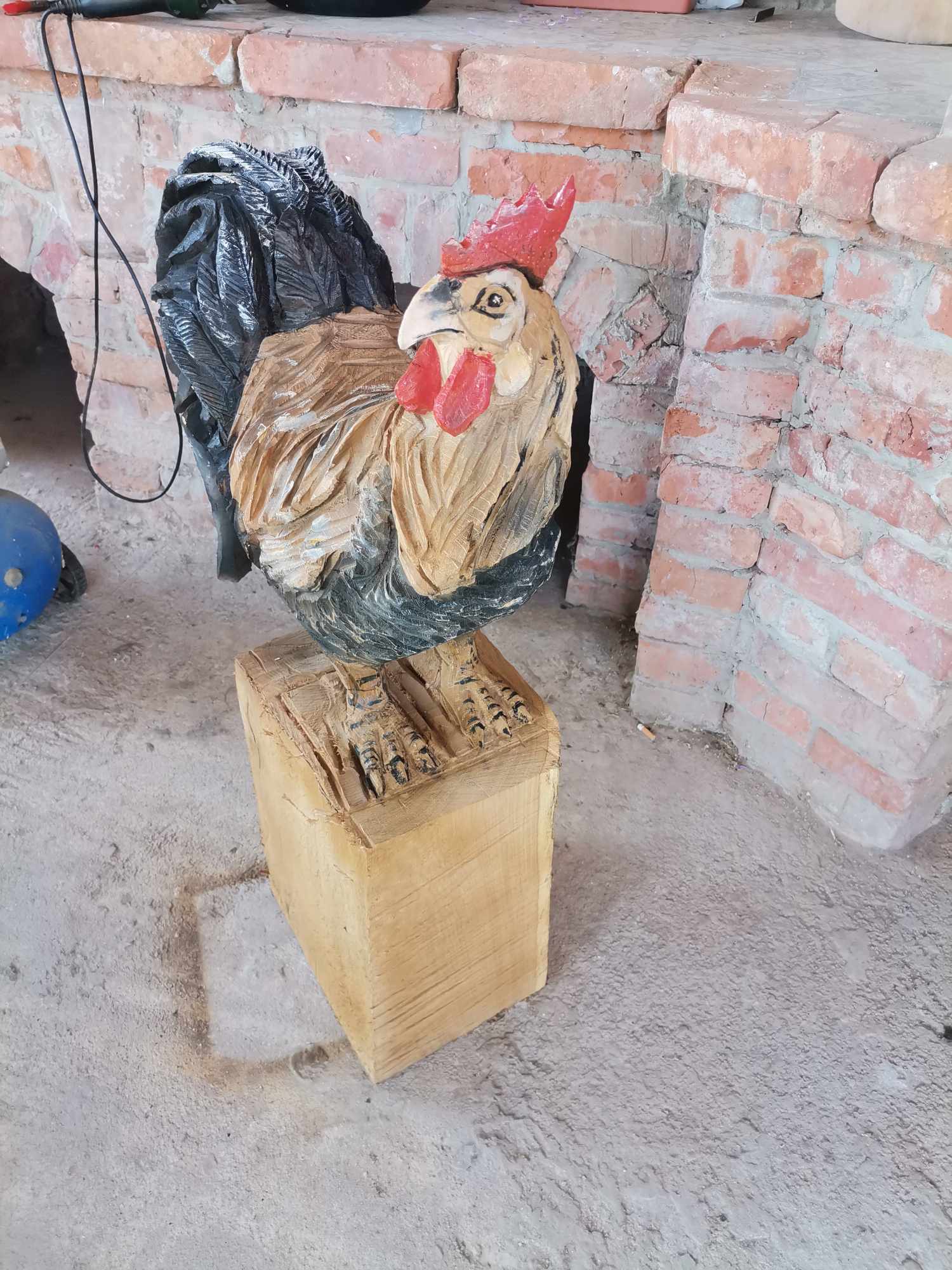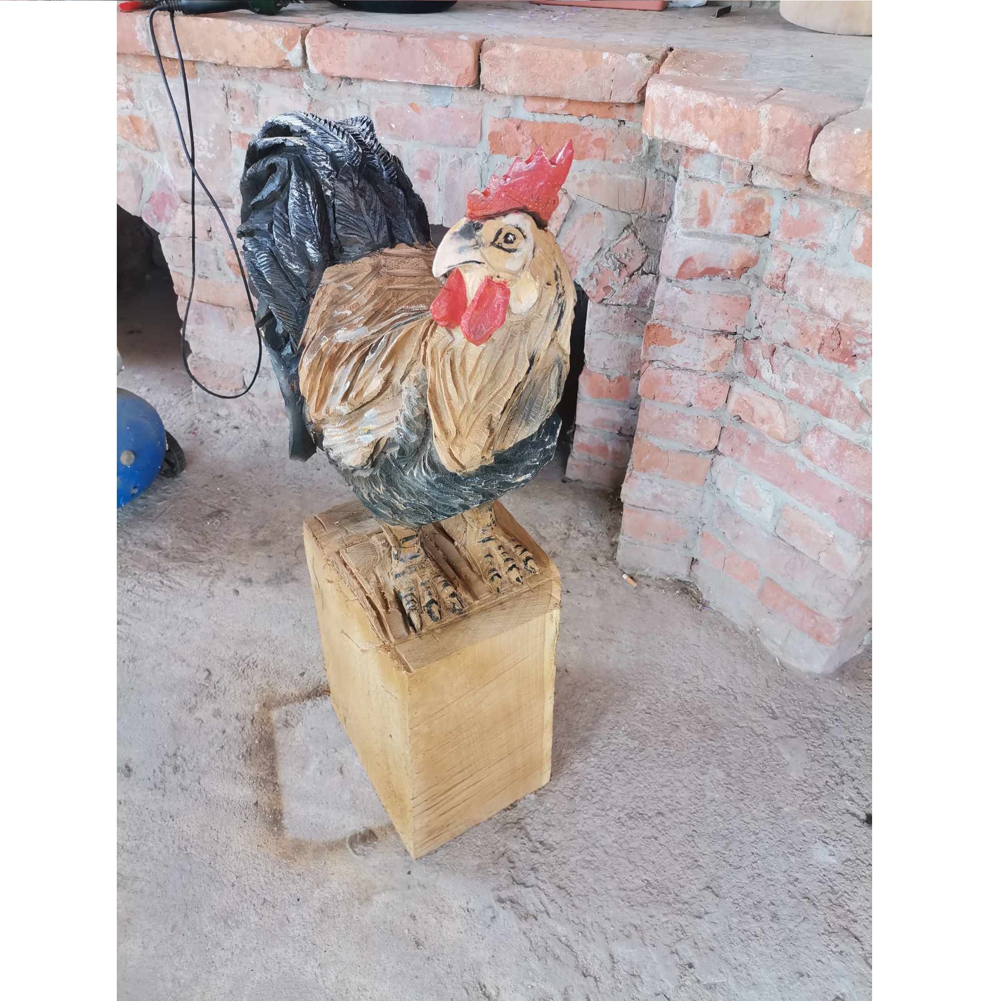 Velký důraz je kladen na detailní provedení peří, hřebínku i tvaru těla, což dodává soše realistický a živý vzhled. Přirozená kresba dřeva zvýrazňuje autenticitu výrobku a podtrhuje jeho rustikální, ale zároveň nadčasový styl. Povrch je pečlivě opracován a ošetřen tak, aby vynikla struktura dřeva a byla zajištěna dlouhá životnost.