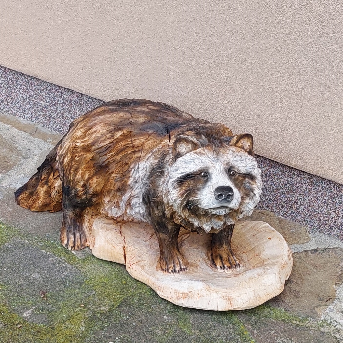 Dominantním prvkem sochy je výrazná hlava s charakteristickou „maskou“ kolem očí, která je propracována s jemností a citem pro proporce. Detailně vyřezávaná srst vytváří plastický trojrozměrný efekt a dodává celé postavě hloubku. Precizně modelované tlapky, zakulacené tělo a přirozeně tvarovaný ocas podtrhují autenticitu a dynamiku kompozice. Každý zářez do dřeva je veden s pečlivostí, aby vynikla struktura materiálu i umělecký charakter výrobku.
