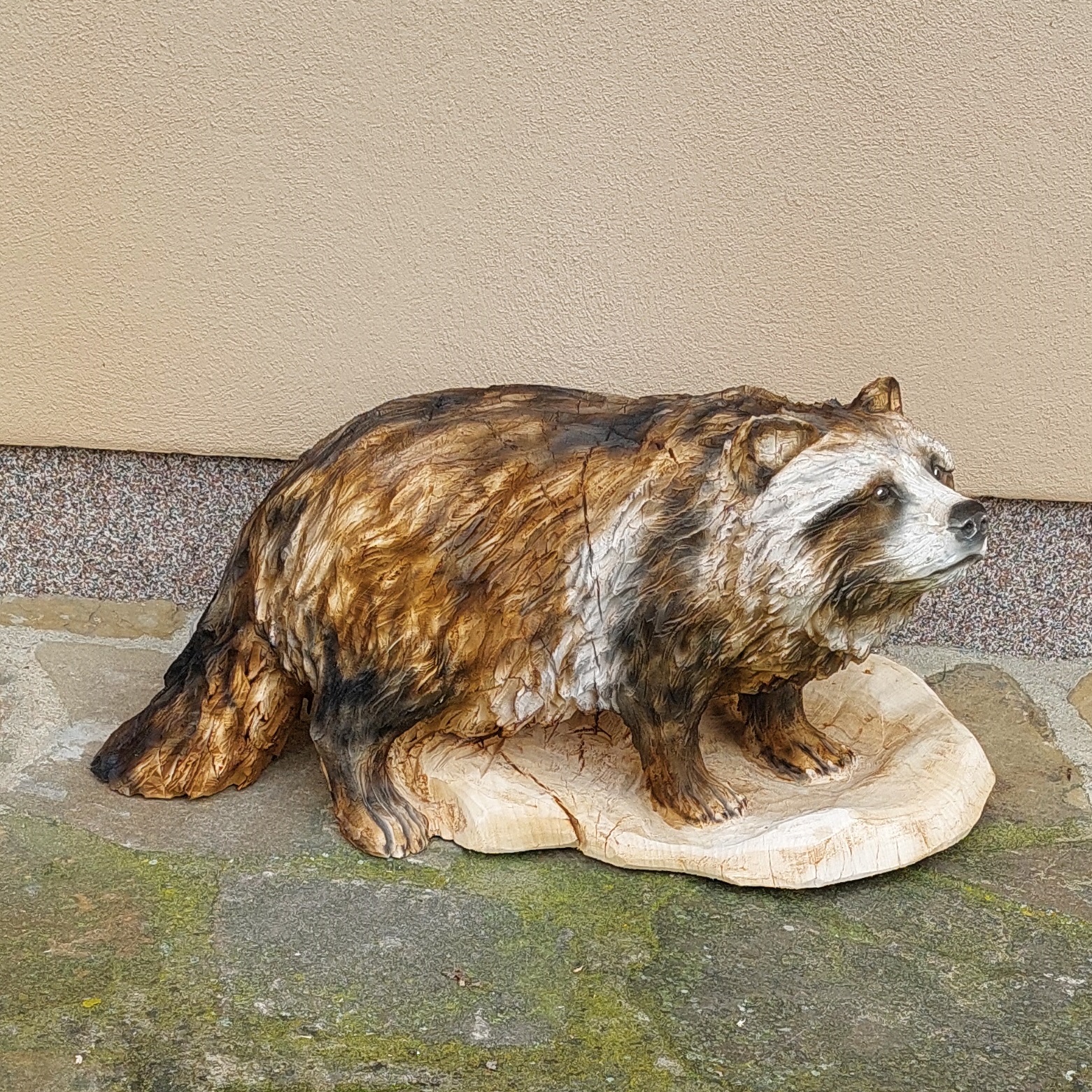 Tato originální dřevěná socha mývala je výsledkem precizní ruční řezbářské práce, která s mimořádným důrazem na detail zachycuje typický vzhled i osobitý charakter tohoto zajímavého lesního zvířete. Každý kus vzniká postupně pod rukama zkušeného řemeslníka, jenž pečlivě modeluje jednotlivé prvky tak, aby byla zachována přirozenost a realistický dojem.