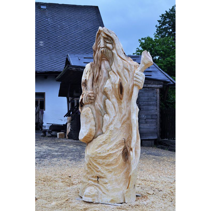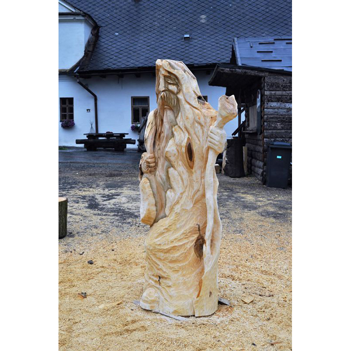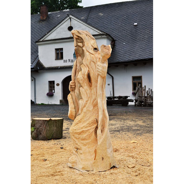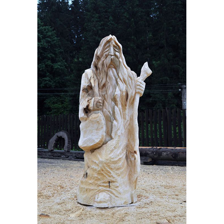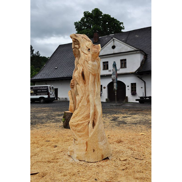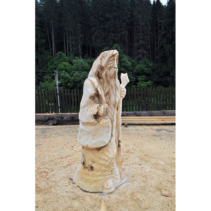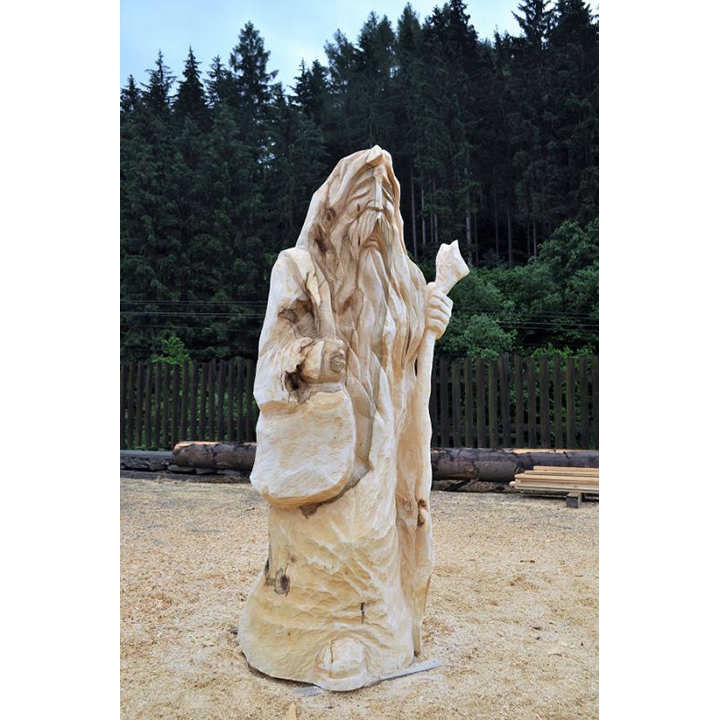 V minulosti chodívalo na pouť mnoho lidí. Šli za lepším životem, zaměstnáním, vzděláním … jednoduše řečeno, za krásnějšími zítřka. Dnes, když už známe auta a letadla už málokdo chodí na pouť. V minulosti však byly poutníci poměrně častými návštěvníky měst a vesnic. Jak asi vypadal poutník? Možná přesně tak jak tato dřevěná socha. Vyřezaná je z lipového dřeva a má výšku 180 cm. Všimněte si, že tento dřevěný poutník má u sebe vše, co by měl mít typický poutník. Má u sebe kapsu s potravinami a vodou a dřevěnou hůl. Může se stát jedinečnou součástí vaší zahrady, případně i interiéru.