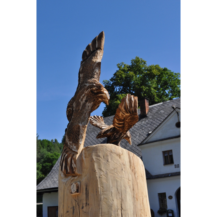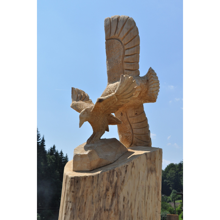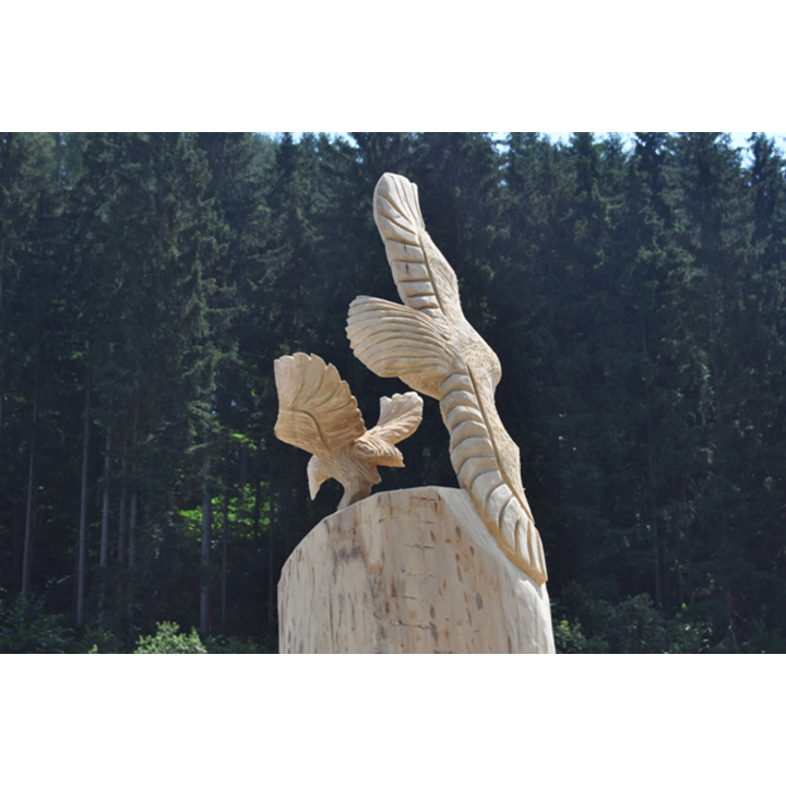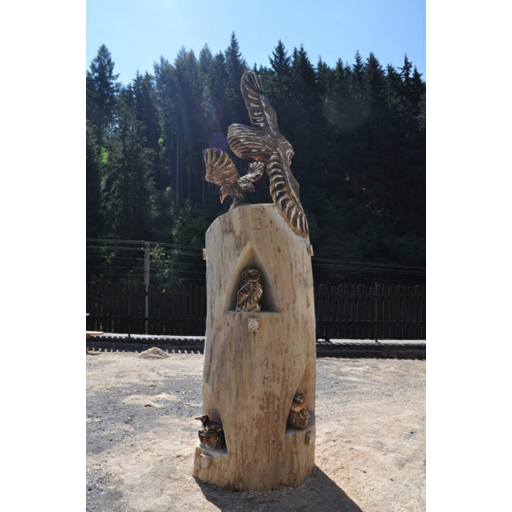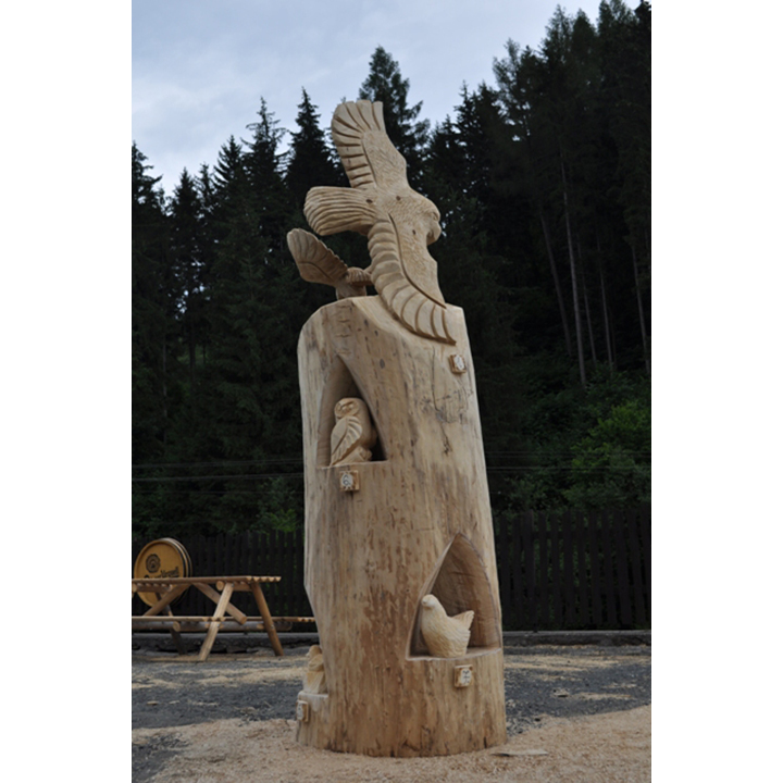 Při detailech na této soše nebudete věřit, že byla vyříznuta jen za pomoci motorové pily. Pilíř zachycuje několik druhů opeřenců. Od těch užitkových jakým je slepice, přes symboly moudrosti, až po dravců kroužících nad tímto mikrosvětem. Ptáci jsou zároveň shora dolů seřazeny v své přirozené hierarchické pyramidě.