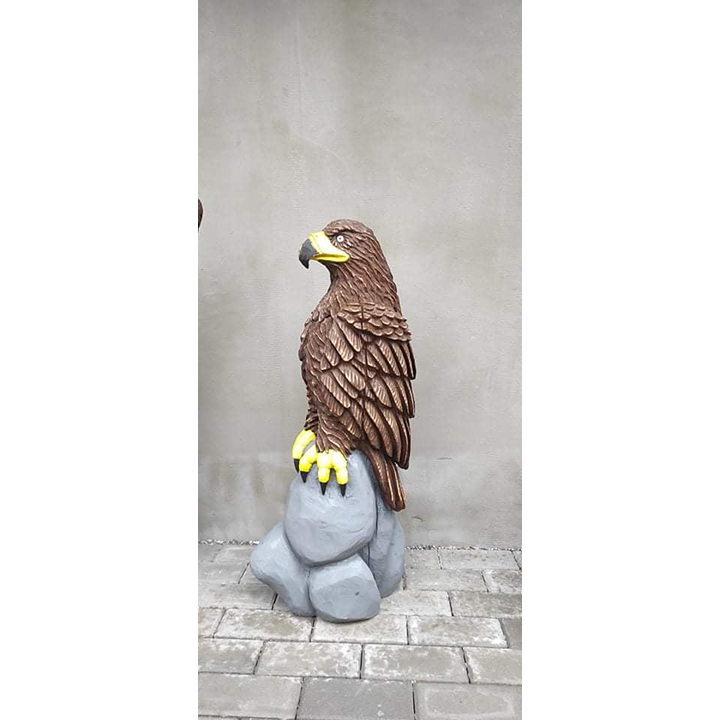 Tato impozantní dřevěná socha orla stojícího na kameni je mistrovským dílem precizní ruční řezbářské práce. Postava je ztvárněna v hrdé a důstojné póze, která dokonale vystihuje sílu, sebevědomí a majestátnost tohoto ušlechtilého dravce. Každý detail je pečlivě propracován – od ostrého pohledu a tvaru zobáku až po realisticky vyřezávané peří a strukturu kamenného podkladu.