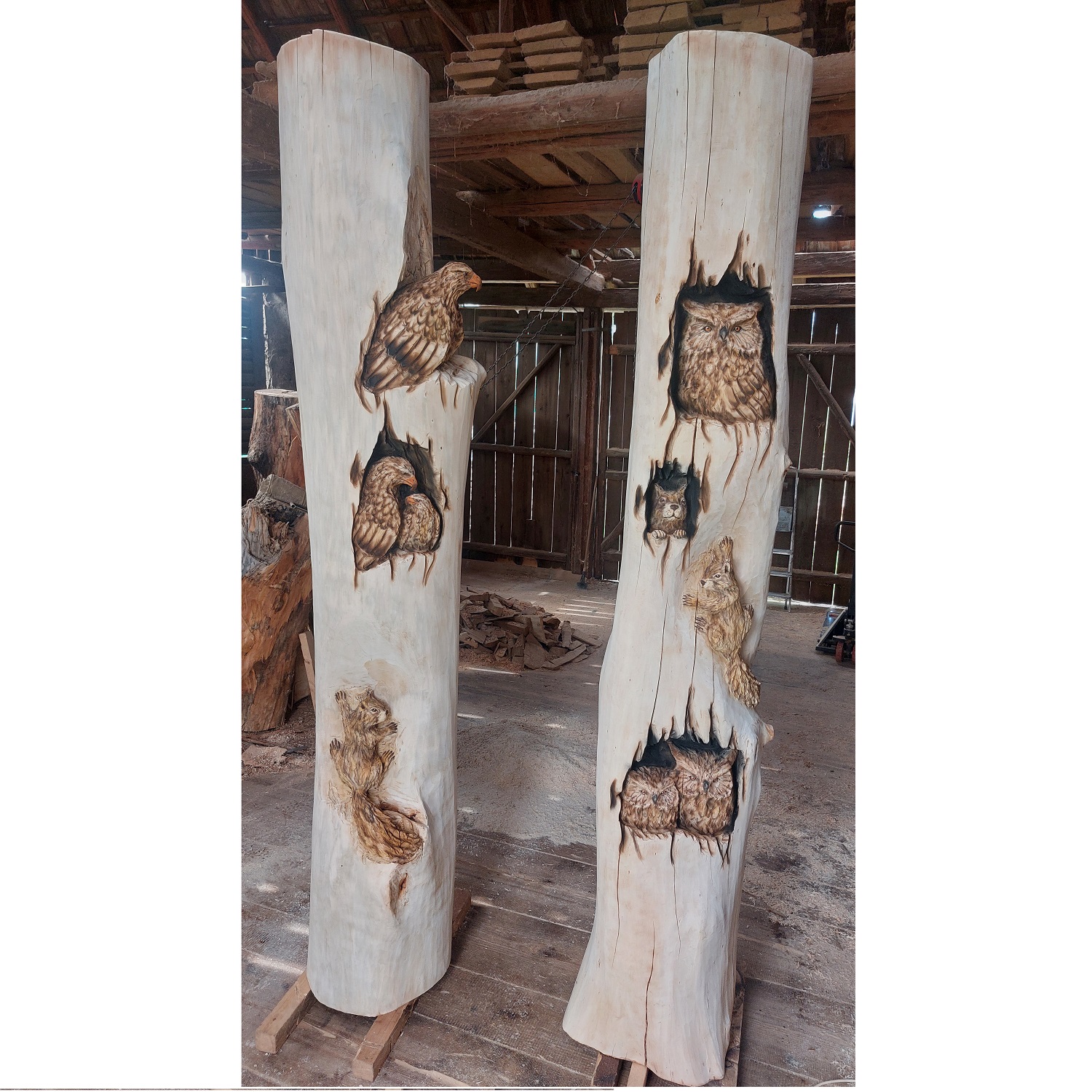 Tato jedinečná ručně vyřezávaná dřevěná socha s motivem lesních zvířat na sloupu je originální dekorací inspirovanou krásou a rozmanitostí přírody. Celá kompozice představuje zajímavý výjev ze života lesa, kde se na jednom dřevěném sloupu setkávají různí obyvatelé lesního prostředí. Díky tomuto motivu působí socha velmi živě a vytváří dojem skutečné lesní scény.