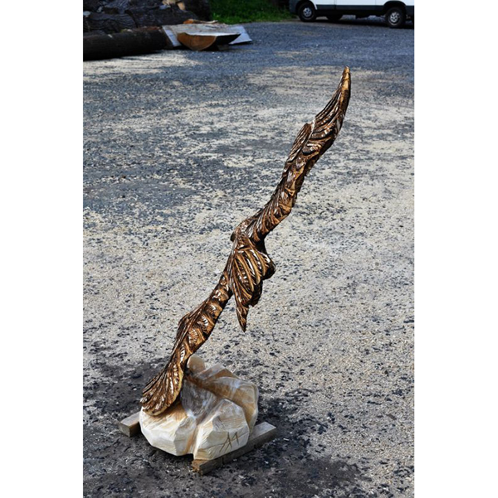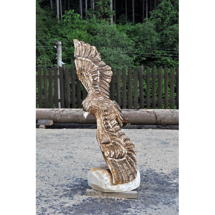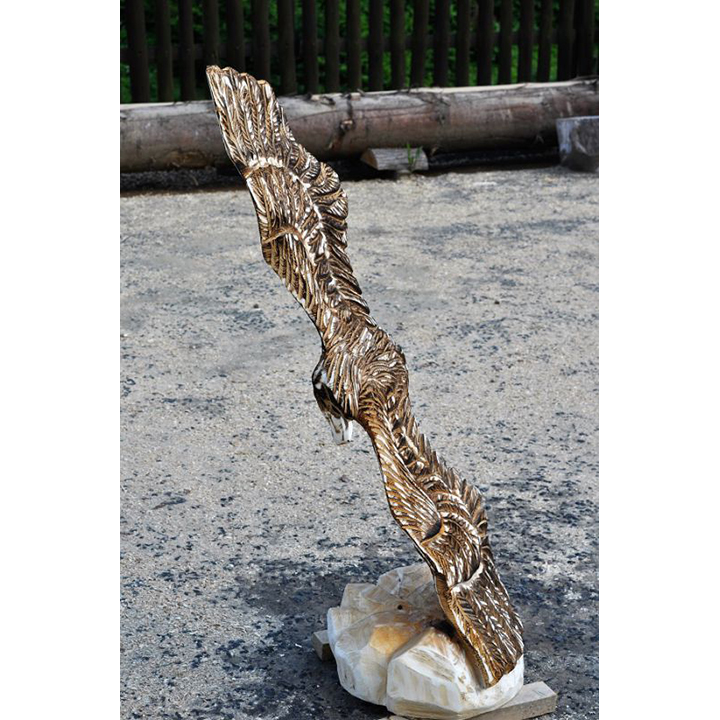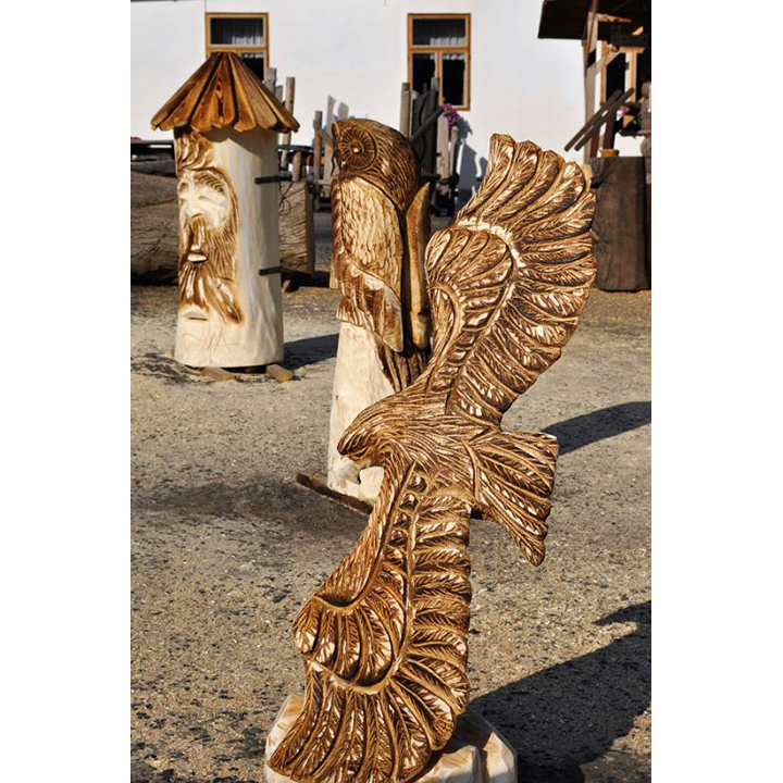 Orel, nádherný dravec, král ptactva může zdobit i vaši zahradu. Podívejte se na tuto dřevěnou sochu letícího orla. Zobrazuje orla v jeho skutečné kráse. Chloubou každého orla jsou právě jeho křídla. Když si orel pořádně rozprostře, tak je to hotová pastva pro oči. Přesně to bylo cílem při řezba této dřevěné sochy. Zobrazit orla v takové poloze, aby si člověk uvědomil majestátnost orlích křídel. Tomu se řekne skvělá ozdoba do zahrady. Nádherná dřevěná socha letícího orla má výšku 120 cm a je vyrobena z lipového dřeva.