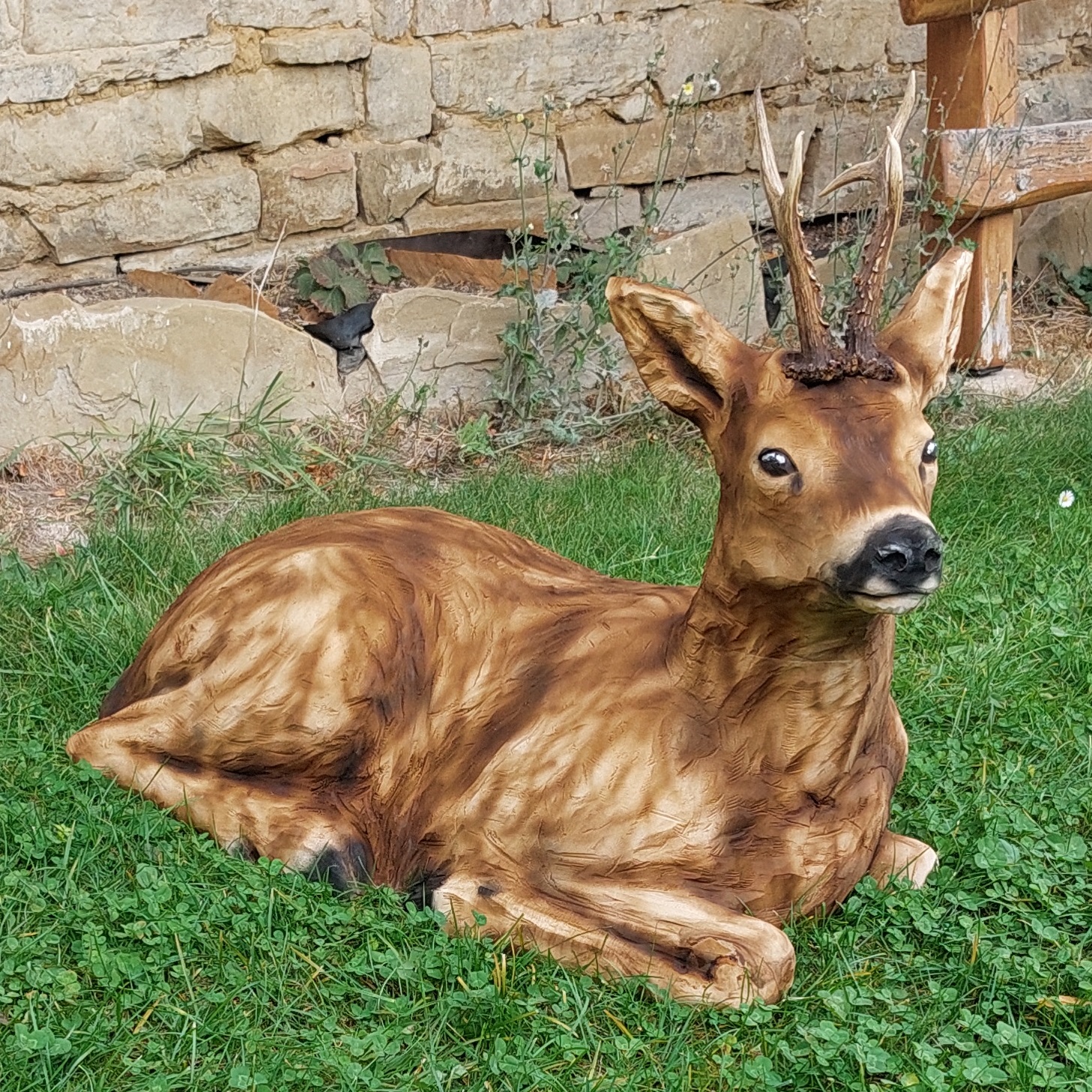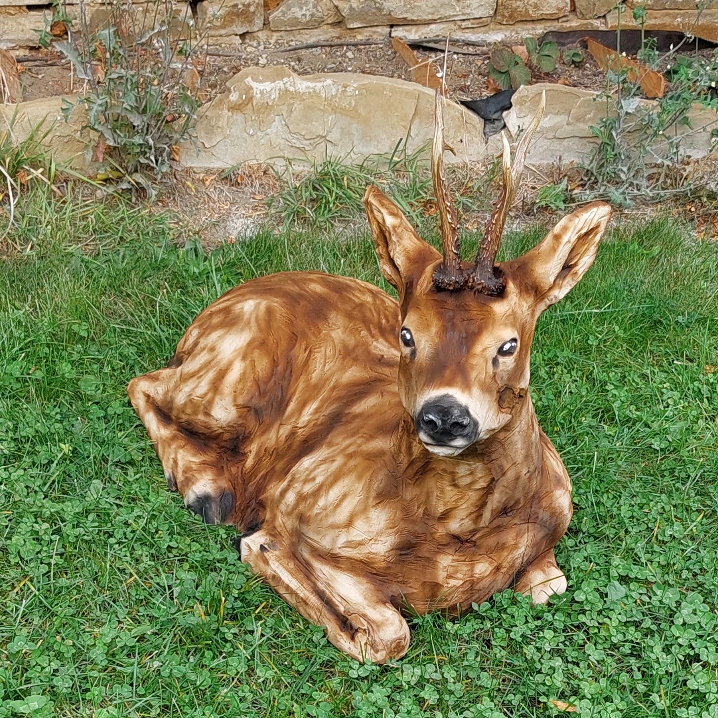 Každý detail je pečlivě propracován – od jemně modelovaných rysů hlavy a něžného výrazu očí až po plasticky vyřezávanou strukturu srsti a přirozené linie těla. Řemeslník věnuje mimořádnou pozornost proporcím, tvaru uší i lehkému zakřivení krku, které dodává soše realistický a živý vzhled. Hloubka řezu vytváří výrazný trojrozměrný efekt, díky němuž působí srnka autenticky z každého úhlu pohledu.