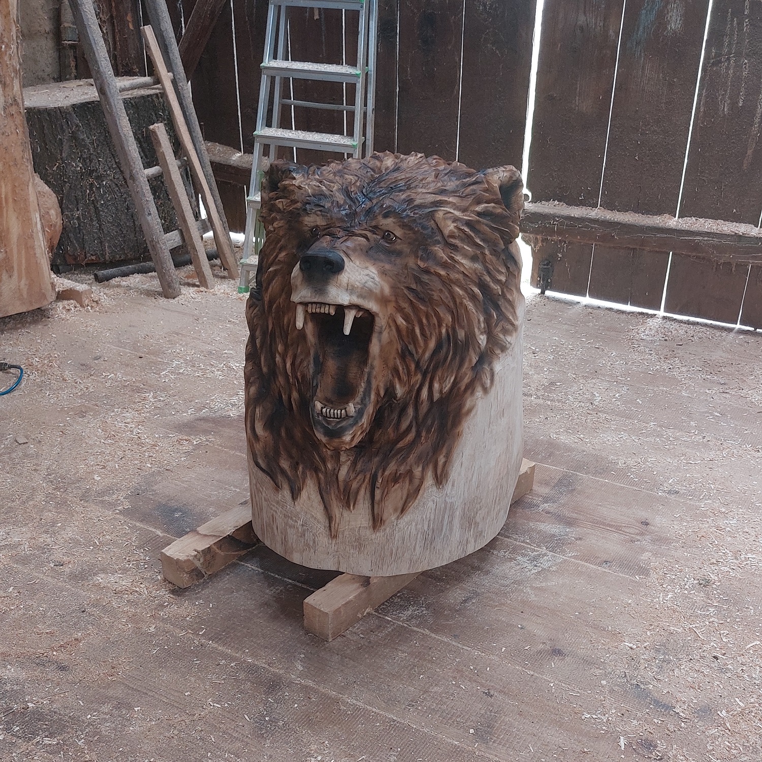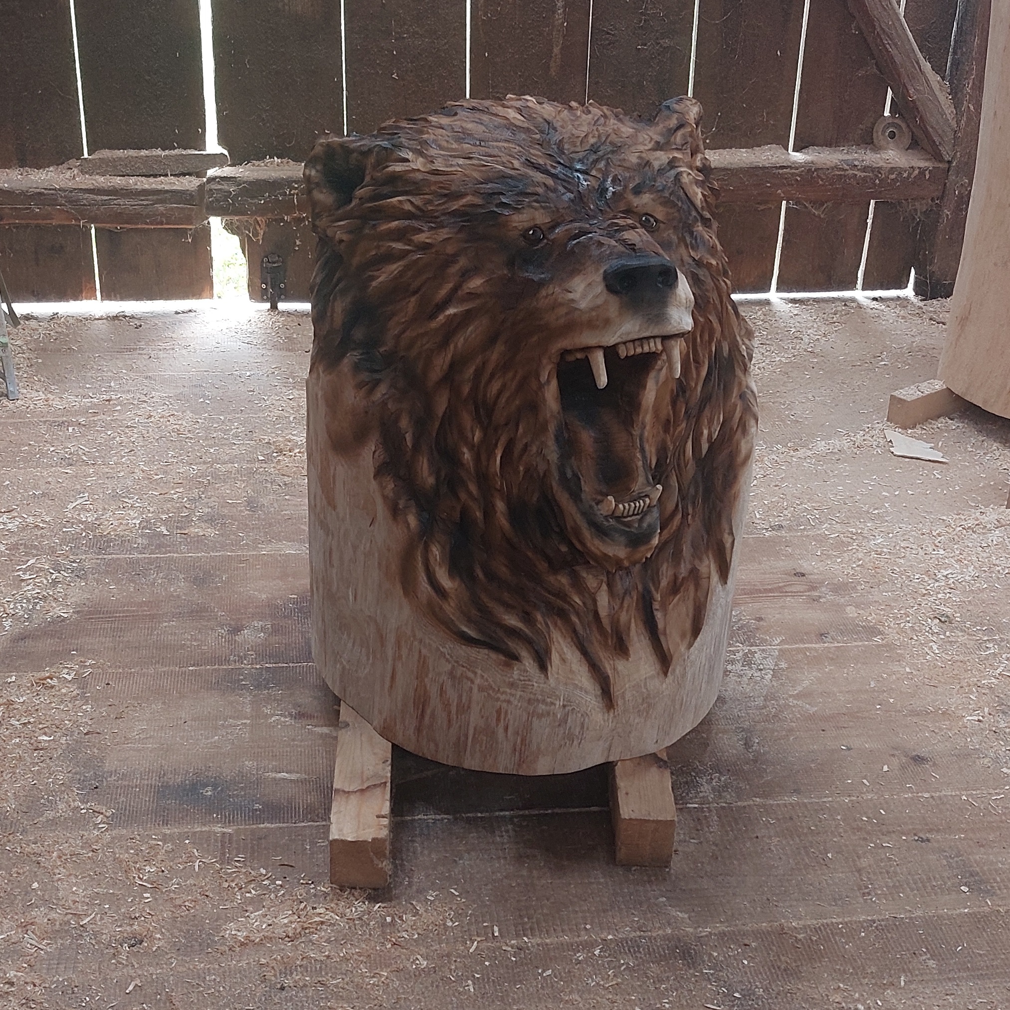 Tato impozantní dřevěná socha medvědí hlavy je výsledkem precizní a poctivé ruční řezbářské práce, která dokonale zachycuje sílu, respekt a divokou krásu tohoto majestátního zvířete. Motiv je zpracován s mimořádným důrazem na realistické detaily a výraz, díky čemuž působí socha velmi autenticky a výrazně.
