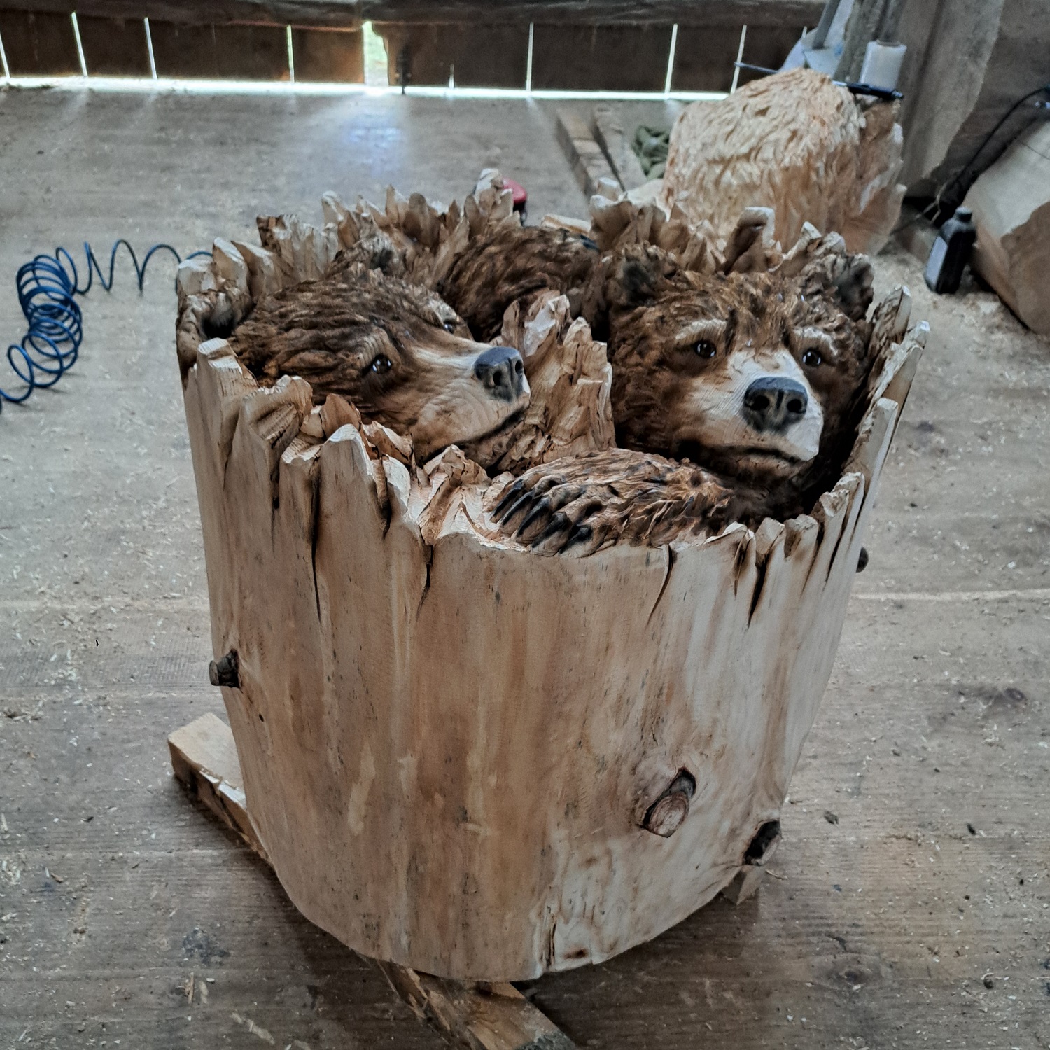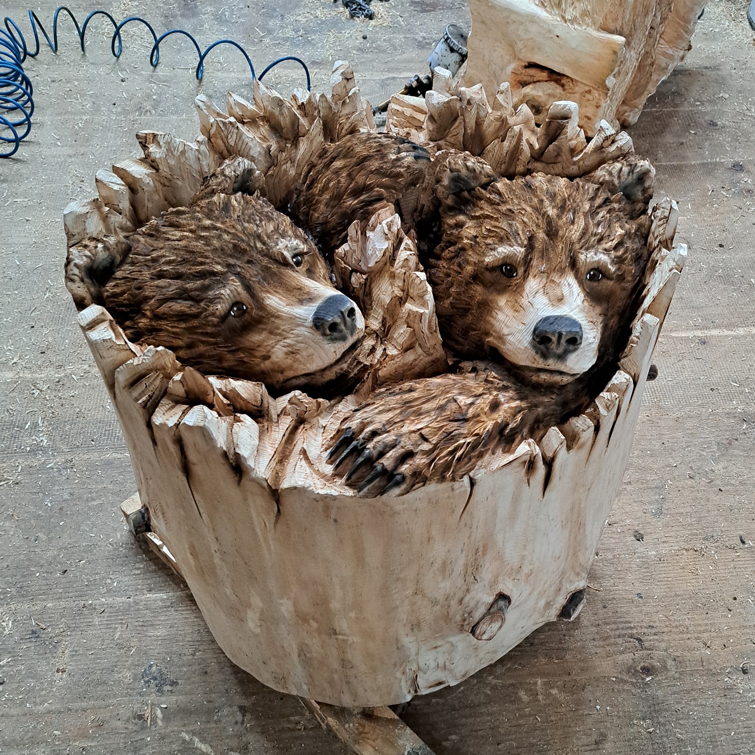 Tato jedinečná dřevěná socha zobrazující medvědy ukryté v dutině stromu je mistrovským dílem precizní ruční řezbářské práce. Kompozice citlivě propojuje motiv divoké přírody s přirozeným tvarem kmene, čímž vzniká harmonický a velmi působivý celek inspirovaný lesním prostředím. Každý kus je vytvářen ručně s maximálním důrazem na detail, hloubku řezu a realistické zpracování.