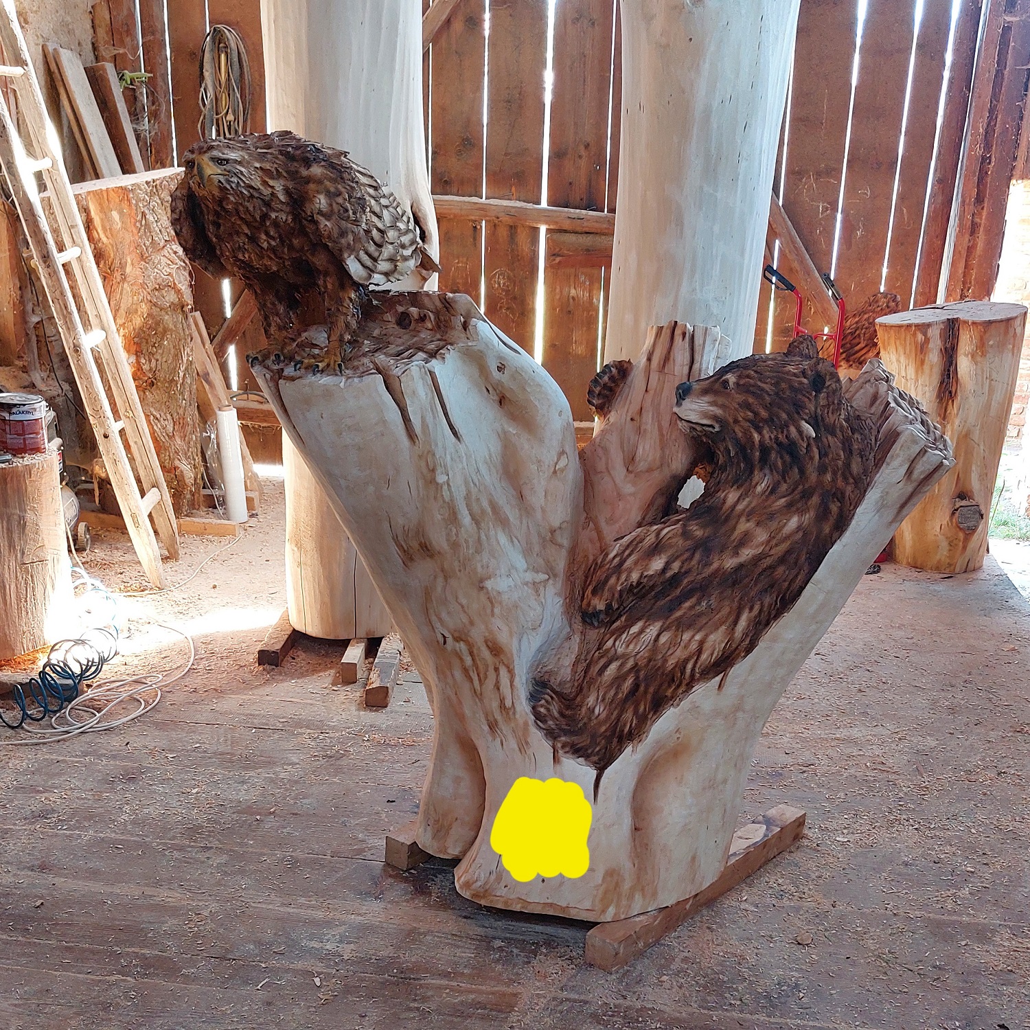 Medvěd je ztvárněn s důrazem na jeho mohutnou stavbu těla, výraznou hlavu a detailně propracovanou strukturu srsti. Jeho postoj působí klidně, ale zároveň silně a sebejistě. Orel je zachycen s roztaženými nebo přirozeně složenými křídly, s ostrým zobákem a pronikavým pohledem. Jemně vyřezávané peří dodává celé postavě lehkost a dynamiku.