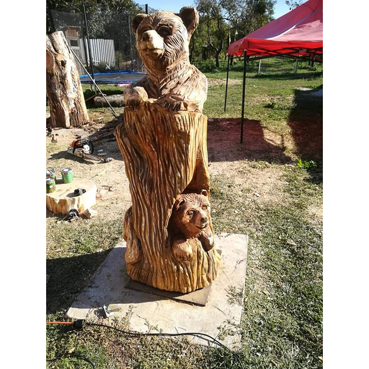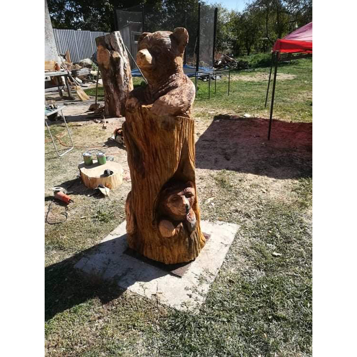 Tato půvabná dřevěná socha medvědích mláďat je výsledkem precizní ruční řezbářské práce, která zachycuje něžnost, hravost a přirozené pouto mezi zvířaty. Každý detail je pečlivě propracován tak, aby vynikla jemná mimika, realistické proporce i struktura srsti malých medvíďat.