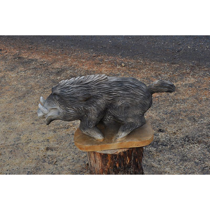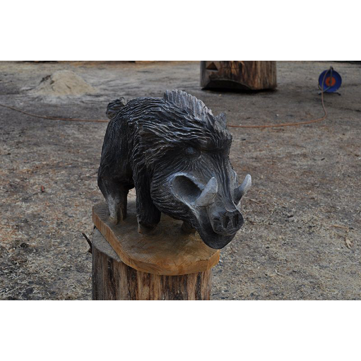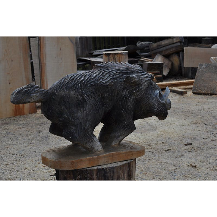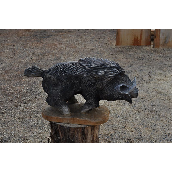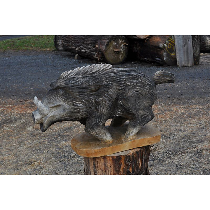 Setkat v lese kance, to věru není nic příjemné. Diviaky dokáží být velmi útočné, zvláště pokud cítí ohrožení svého života. Menší míra agresivity se vyskytuje spíše u mláďat divokých prasat. Možná i to je důvod, proč se terčem uměleckého zájmu stalo právě mládě divočáka. Výsledkem je tato dřevěná socha, která má výšku 50 cm a celkovou délku 90 cm. Vyrobena je z topolového dřeva. Když se podíváte na to, jak se mistru podařilo vyhrát se s detaily, i zapomenete, že divoká prasata umí být velmi agresivní. Krásná, přímo až realistická socha se může stát součástí vaší zahrady. Pokud vám není cizí lovecká tématika, lze ji umístit v blízkosti krbu.