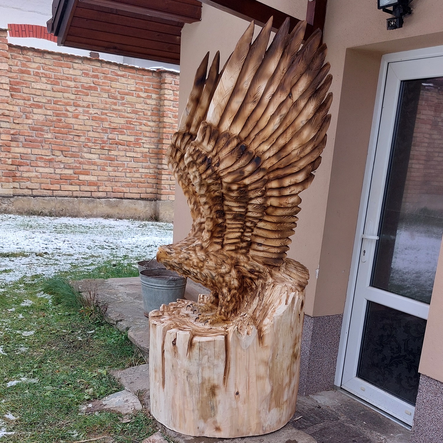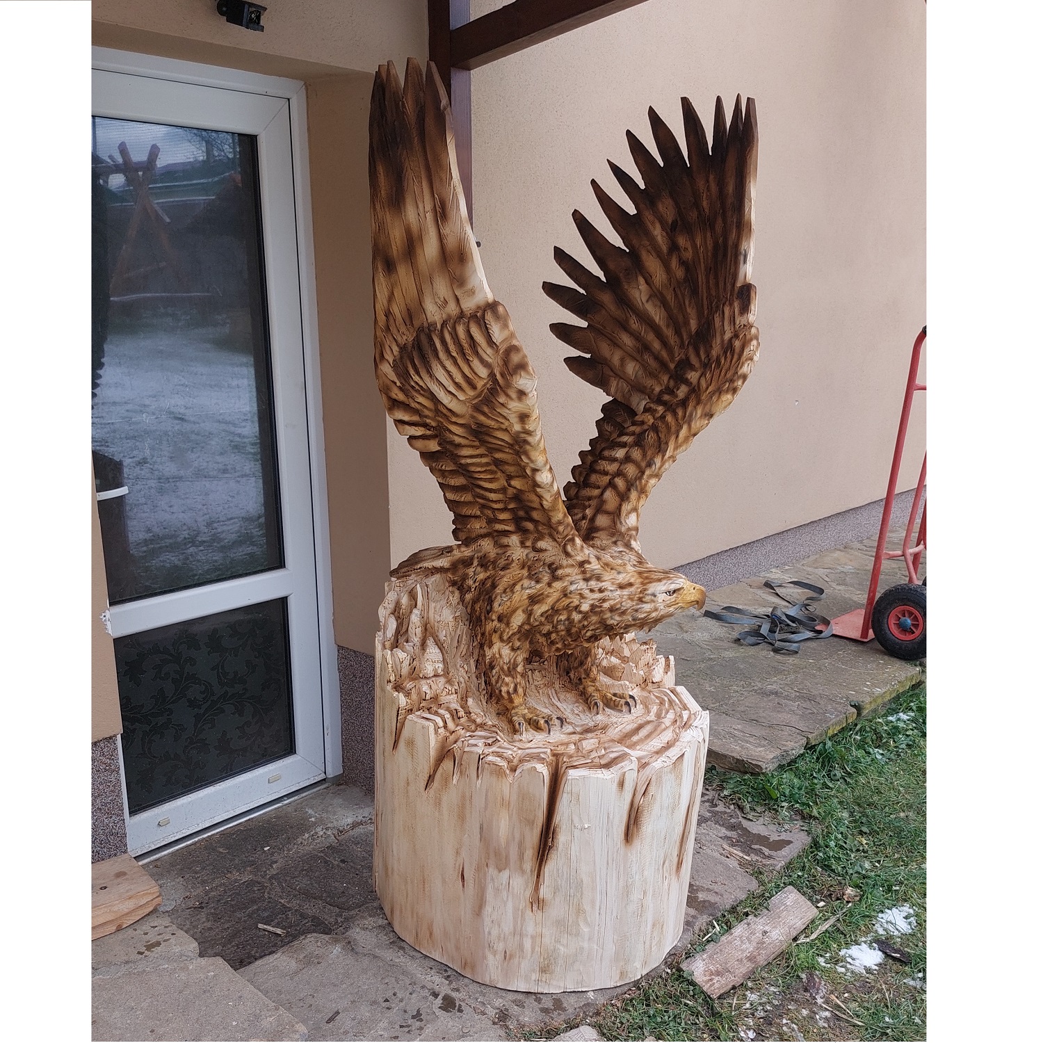 Tato impozantní dřevěná socha přistávajícího orla je výsledkem precizní ruční řezbářské práce, která dokonale zachycuje dynamiku pohybu, sílu a majestátnost jednoho z nejrespektovanějších dravců v přírodě. Kompozice zachycuje okamžik těsně před dosednutím – orel má roztažená křídla, připravené pařáty a soustředěný pohled, což dodává celé soše energii a dramatický výraz.