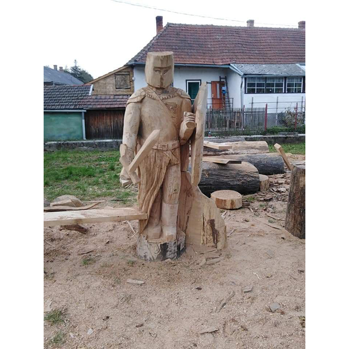 Rytíř je ztvárněn s důrazem na detail brnění, výraz tváře, držení meče či štítu a celkový postoj, který působí odvážně a důstojně. Plastická řezba dodává soše hloubku a realistický vzhled, zatímco přirozená struktura dřeva podtrhuje její autentický a nadčasový charakter. Povrch je precizně opracovaný a ošetřený tak, aby byla zajištěna dlouhá životnost i odolnost.