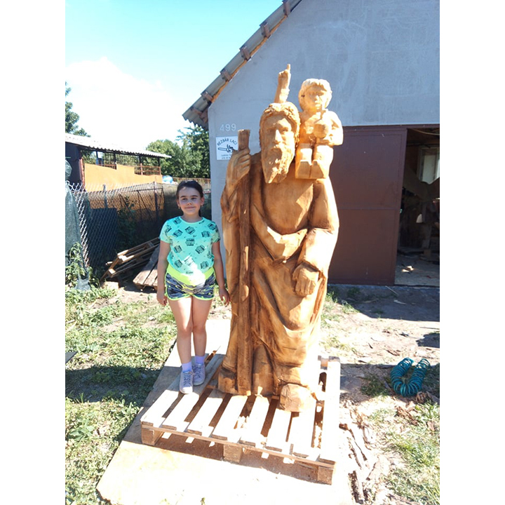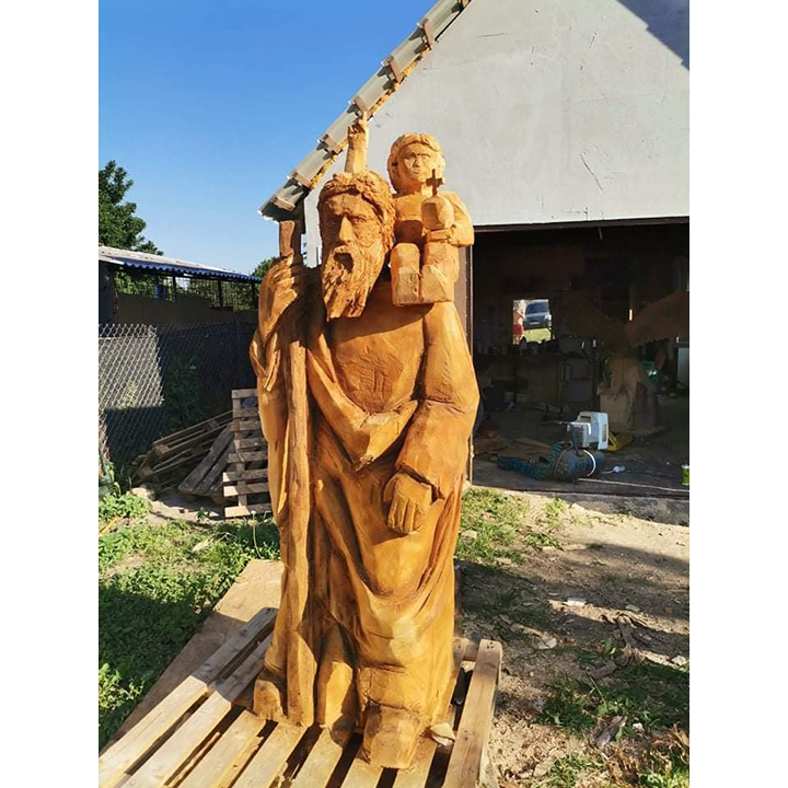 Postava svatého Kryštofa je ztvárněna s mimořádnou pečlivostí – výraz obličeje, postoj, drapérie oděvu i symbolické prvky jsou propracovány do nejmenších detailů a dodávají soše klidný, důstojný a zároveň silný výraz. Plastická řezba vytváří hloubku a přirozený pohyb, zatímco kresba dřeva podtrhuje autenticitu materiálu a jedinečnost každého kusu. Povrch je pečlivě opracovaný a ošetřený tak, aby si socha zachovala svou krásu i dlouhou životnost.