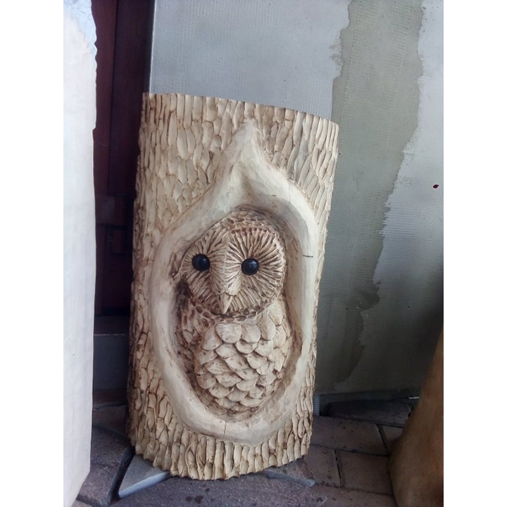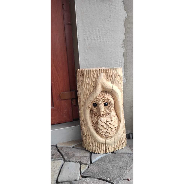 Sovička je usazena v realisticky ztvárněné dutině kmene, přičemž výrazné oči, detailně propracované peří a jemné rysy hlavy dodávají celé kompozici živý a přátelský charakter. Plastická řezba vytváří hloubku a zajímavý vizuální efekt, který vynikne při pohledu zblízka i z dálky. Přirozená kresba dřeva podtrhuje autenticitu díla a povrch je pečlivě opracován a ošetřen pro dlouhou životnost.