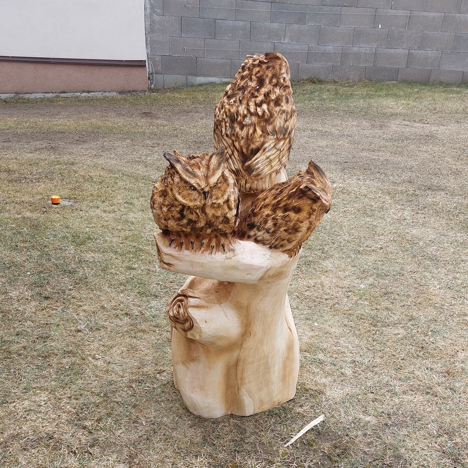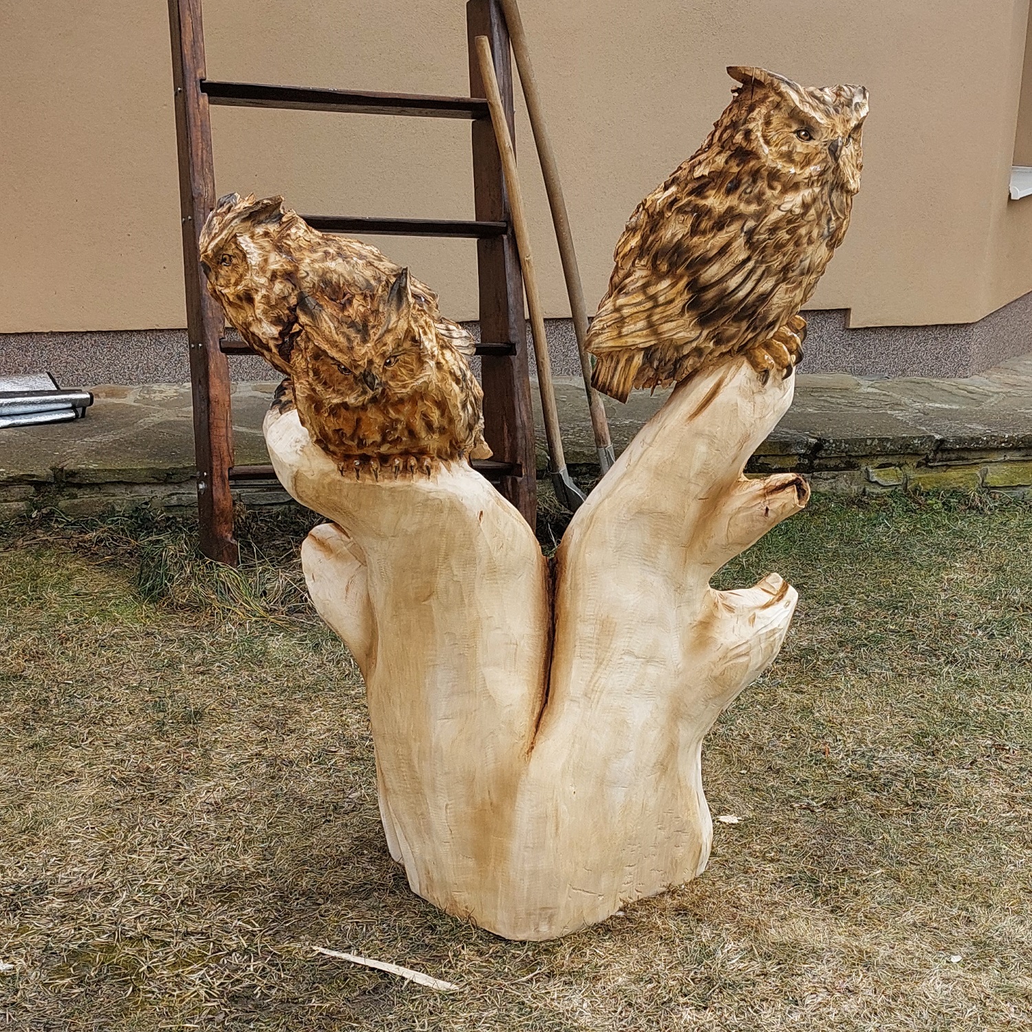 Ručně vyřezávaná socha – Sovy na pařezu
