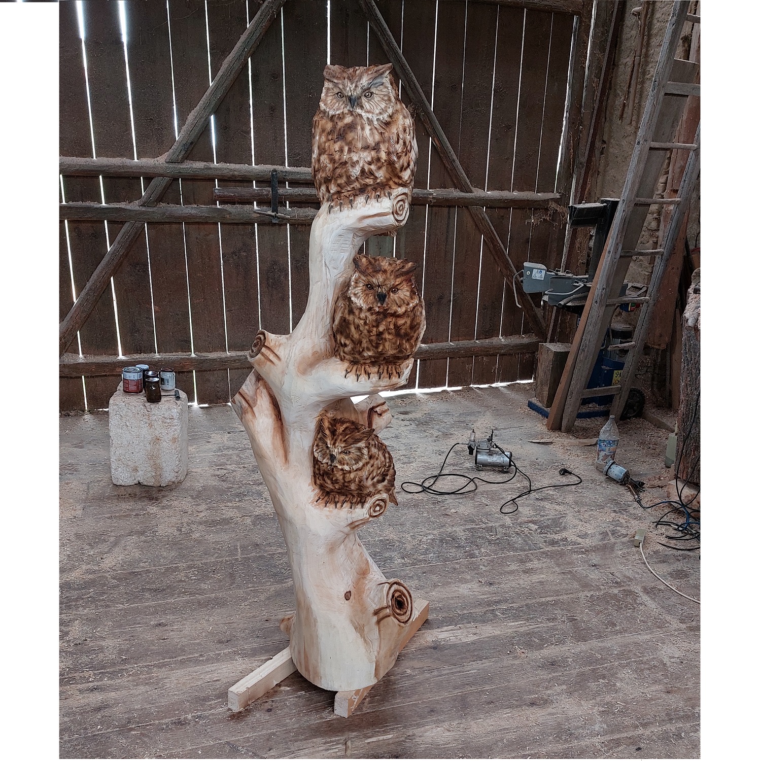 Socha je vyrobena z kvalitního masivního dřeva a vzniká precizní ruční prací zkušeného řezbáře. Každý kus je tvořen s velkou trpělivostí a důrazem na detail, aby byl zachycen nejen vzhled sov, ale i přirozená struktura stromu. Ruční řezba umožňuje vytvořit jemné linie a plastické detaily, které dodávají celé soše výrazný trojrozměrný efekt.