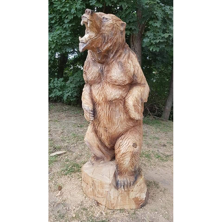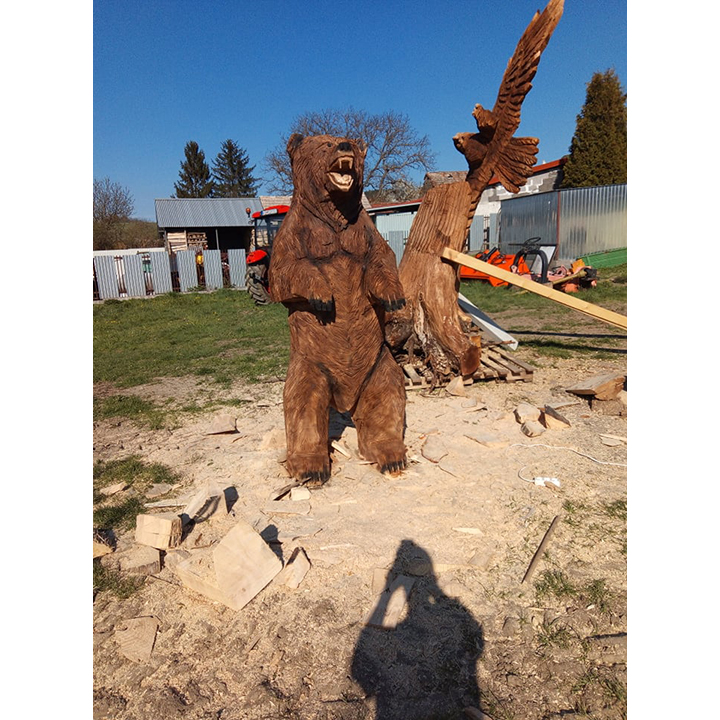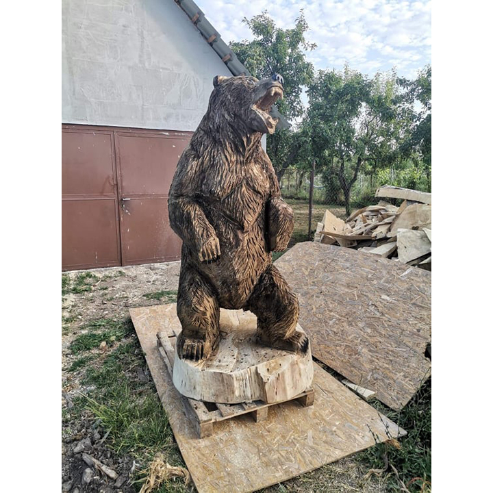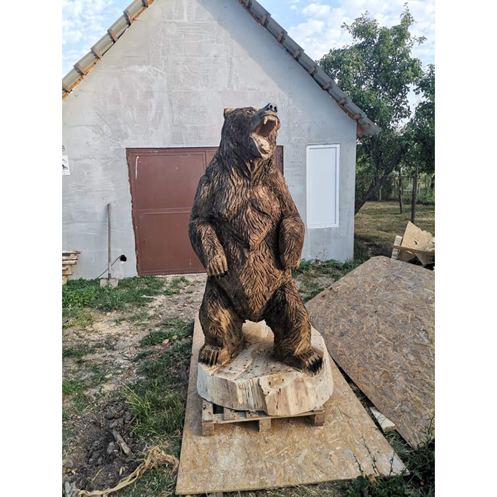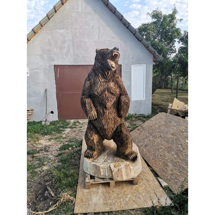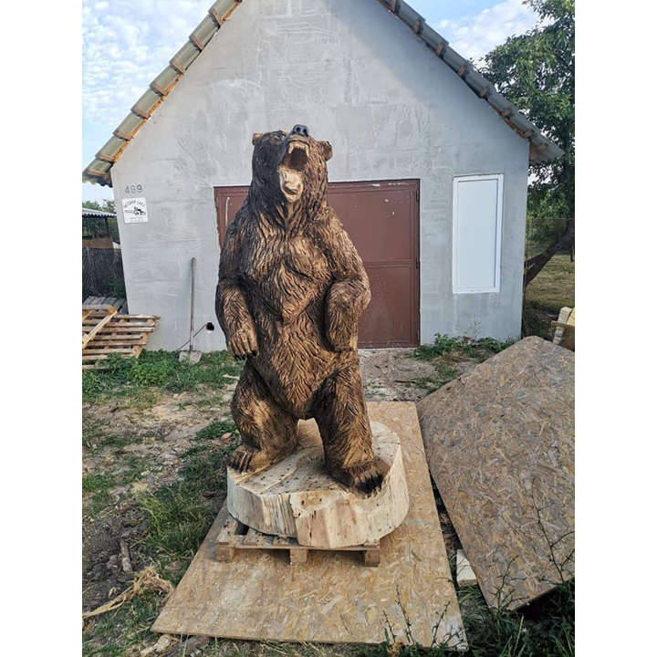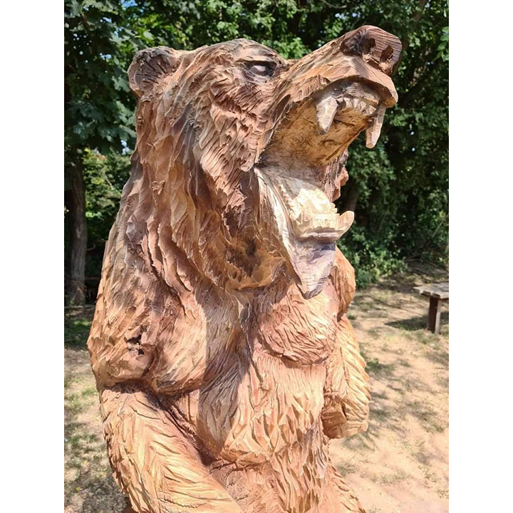 Tato výrazná dřevěná socha s názvem „Zuřivý medvěd“ je výsledkem náročné a precizní ruční řezby, která zachycuje divokost, energii a nespoutanou sílu přírody. Každý kus je originál vytvořený z masivního dřeva, do něhož řezbář promítá své zkušenosti, cit pro detail a respekt k přírodnímu materiálu.